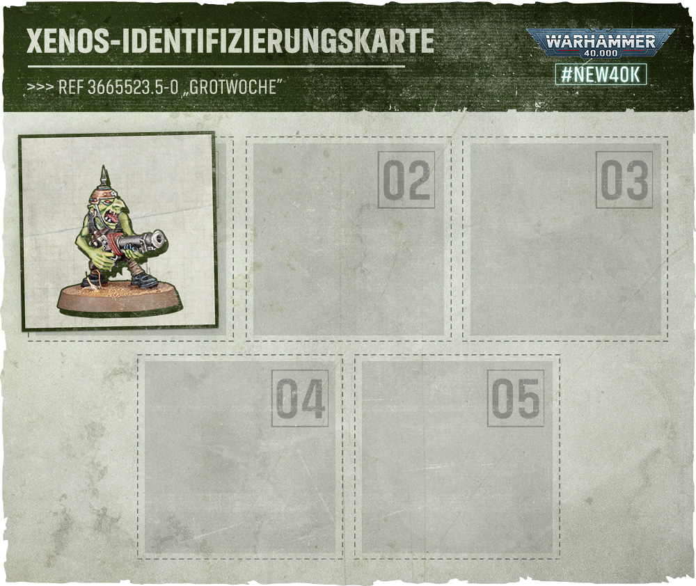 Wir werden uns über die Woche noch mehr Grots ansehen und herausfinden, was sie zu deiner Armee beitragen können. Schau also morgen wieder vorbei, und füge deiner Xenos-Identifizierungskarte* einen weiteren Grot hinzu.