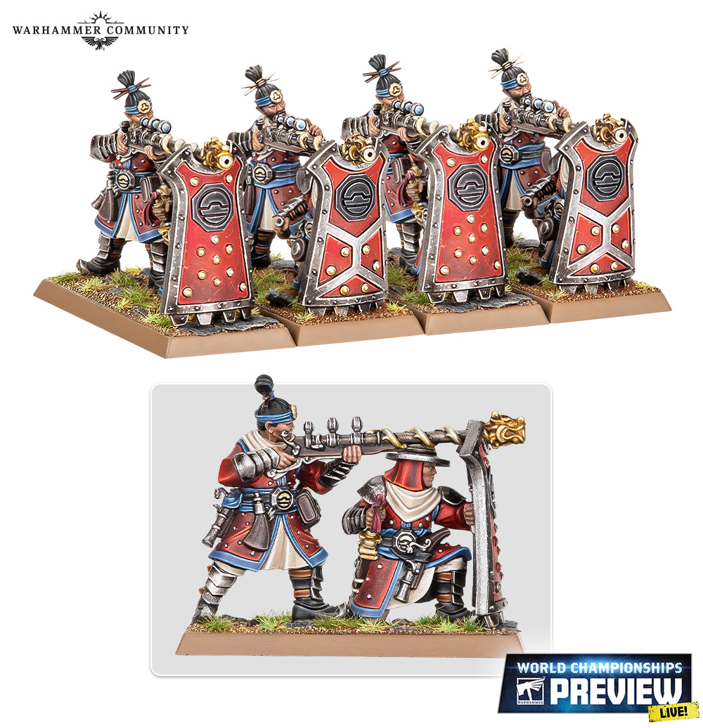 Copious firearms of all shapes and sizes are produced by the smoke-belching foundries of Nan-Gau and deployed in defence of Grand Cathay, with one of the most common being the long-barrelled rifles used by Crane Gunner Teams. Carried by a pair of gunners, and usually fixed to a tower shield for greater stability, these extremely accurate rifles are used to lay low enemy regiments, and single out heroes and monsters for swift execution.