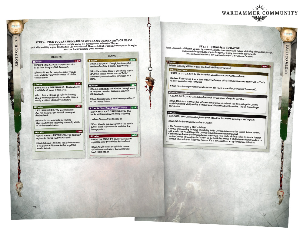 Along with the usual additions of thematic battleplans, Paths, and enhancements, the upcoming Path to Glory supplement Blighted Wilds will enable you to erect your own Landmark of Ghyran – a mystical monument, floating metalith, or ironclad bastion that supports nearby units with special abilities of your choosing.