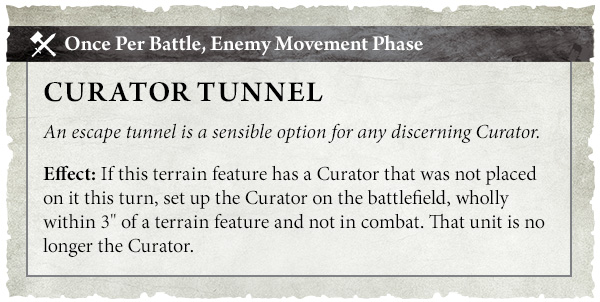 Effect: If this terrain feature has a Curator that was not placed on it this turn, set up the Curator on the battlefield, wholly within 3" of a terrain feature and not in combat. That unit is no longer the Curator.