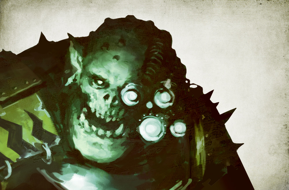 While many Ork Bosses left Armageddon alongside Ghazghkull at the height of the Third War for Armageddon, Big Mek Glitztoof stayed behind and violently assumed control of the Ork-held Hive Tempestora. His erratic moods and tendency to lash out at his Boyz for the slightest infraction have made him as much a terror to his own Boyz as he is to Imperial forces, though this all-pervasive fear of his next summary execution has kept many of the Orks lurking in Tempestora in line.