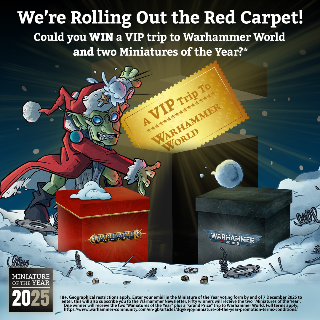 Whatever your favourite game system or faction is, you can vote for what you think the best miniatures of 2025 are by clicking the button below. If you sign up for the Warhammer newsletter – or are already subscribed – you’ll be entered into a draw to win the top miniature from the Warhammer 40,000 and Warhammer Age of Sigmar categories. There will be 50 winners, and as a special bonus a Grand Prize winner will also win a VIP trip to Warhammer World. The competition will run as long as the poll is open. Terms and conditions apply.
