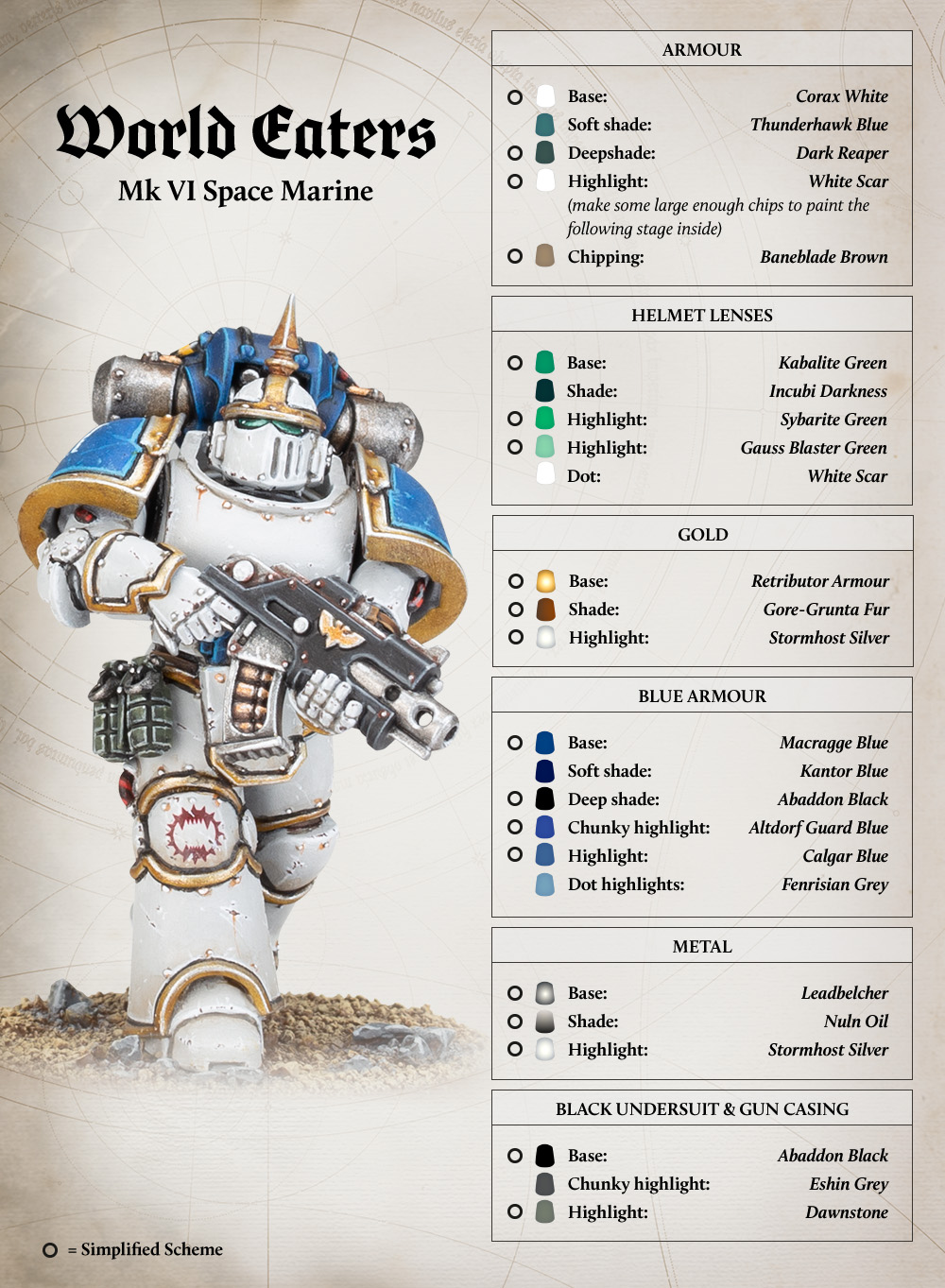 At the onset of the galactic civil war the World Eaters were clad in livery of white, with secondary elements in blue. As the war grinds onwards and battle plate come to degrade, the blue is often replaced by the red of clotted blood, the more blooded the warrior, the more red he bears upon his armour.