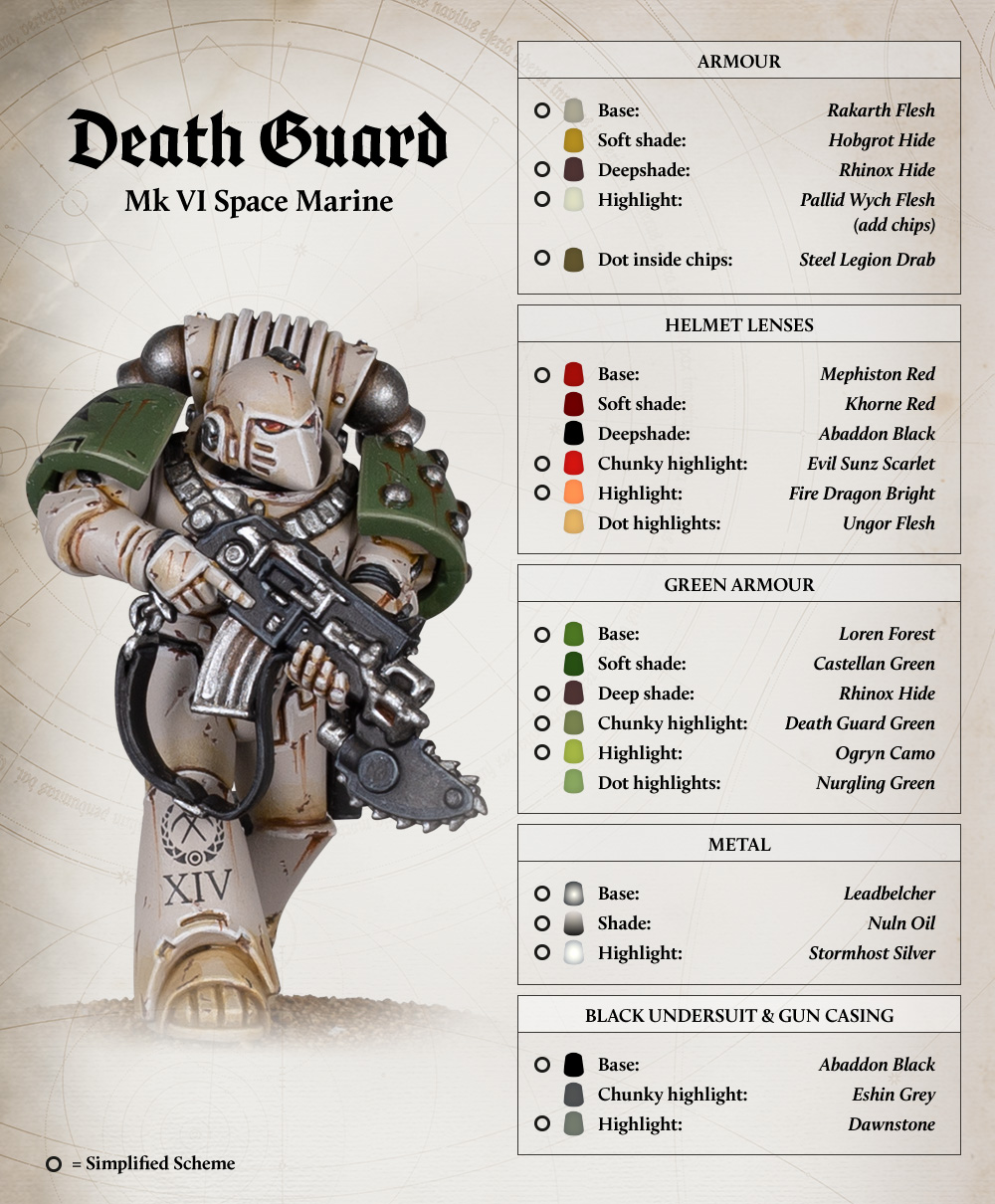 The Death Guard wear a livery of off-white, with secondary elements in green and banding of dull gold or bronze. By long-standing tradition, superficial surface wear and weathering is left unattended until a campaign is resolved, a habit likely to be rooted in the culture of Barbarus.