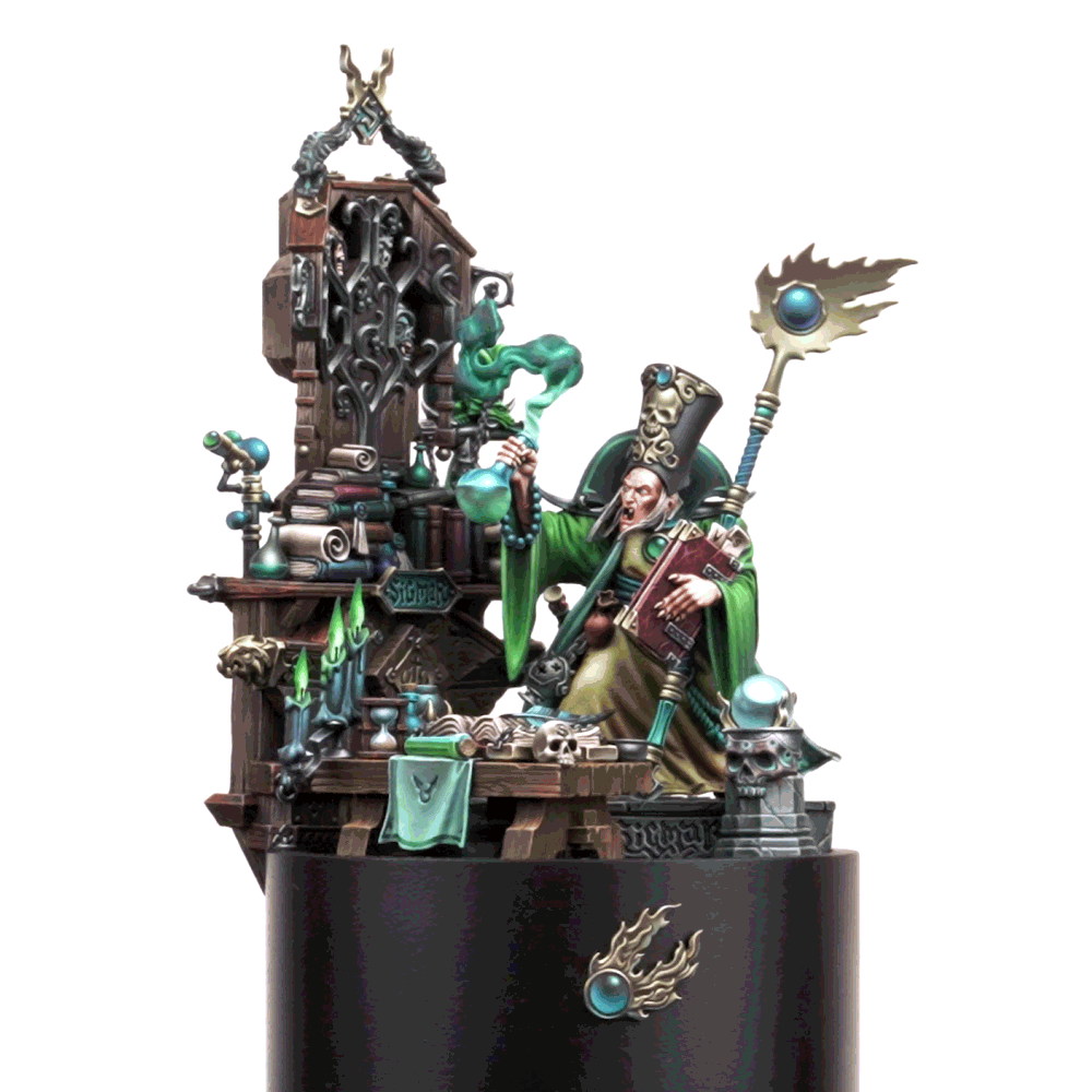 In his words, the miniature was converted from at least 17 different Warhammer kits, stretching across Warhammer Age of Sigmar, Warhammer: The Old World, and even a little Warhammer 40,000 as a treat – along with some custom parts he hand-sculpted himself. Can you spot any pieces from the following kits?