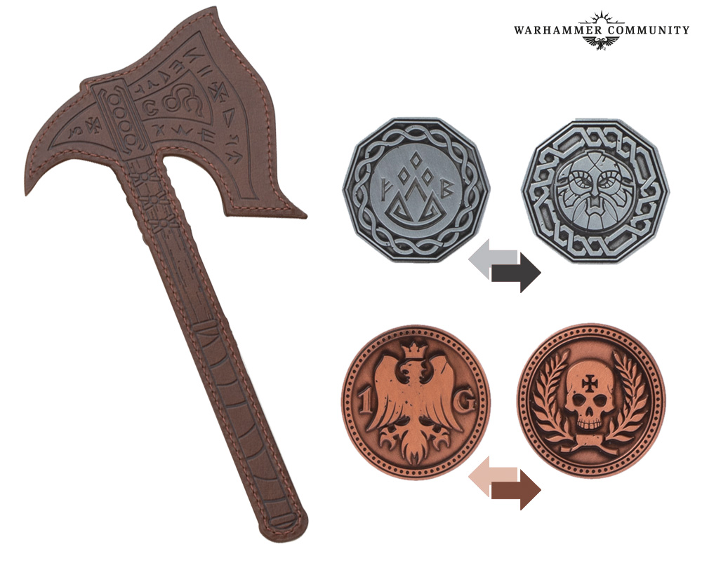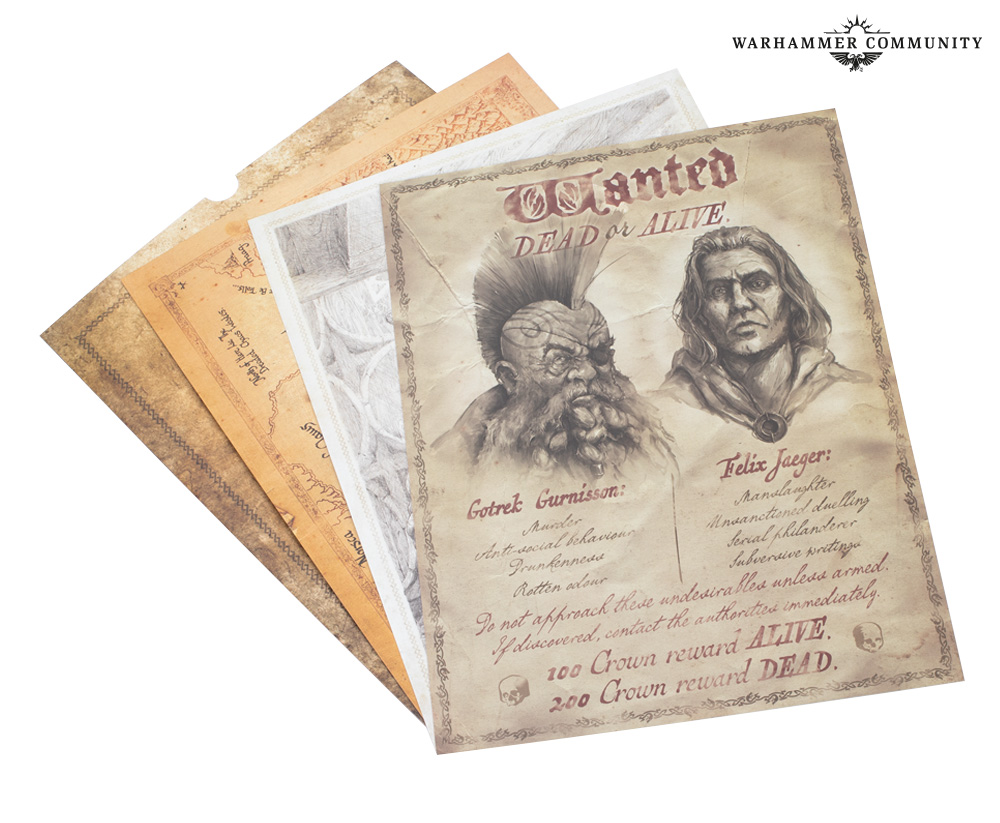 Two coins are also included in the set, one round to match the currency of the Empire, one decagon to match those traded in the Dwarf holds. Then there’s a series of three art prints – one of Gotrek and Felix having a few pints together, a map of the Old World, and a wanted poster for the troublesome duo that confirms they’re sought dead rather than alive. They all come in a matching sleeve, but we’ve saved the best til last.