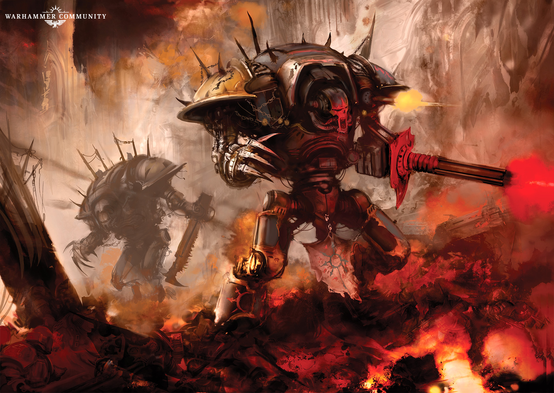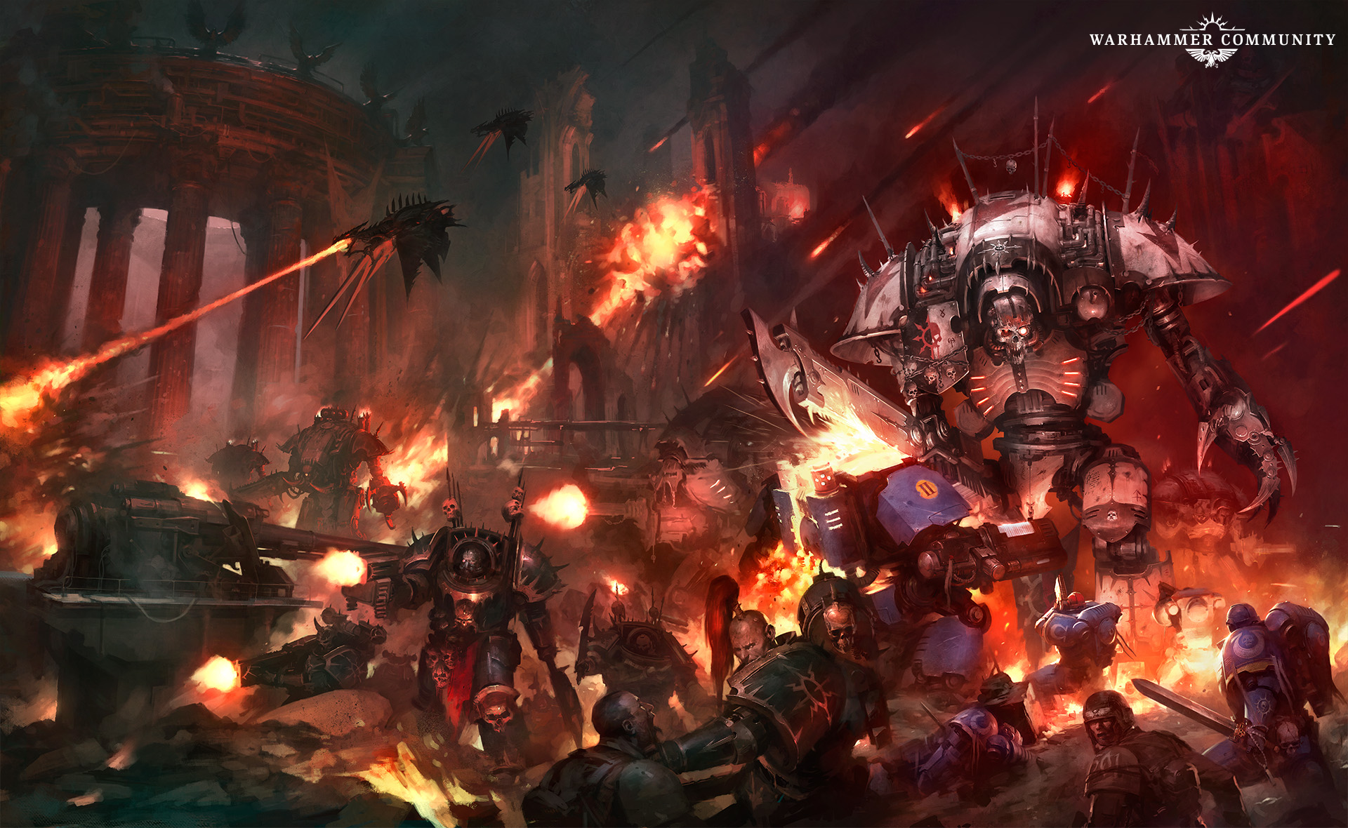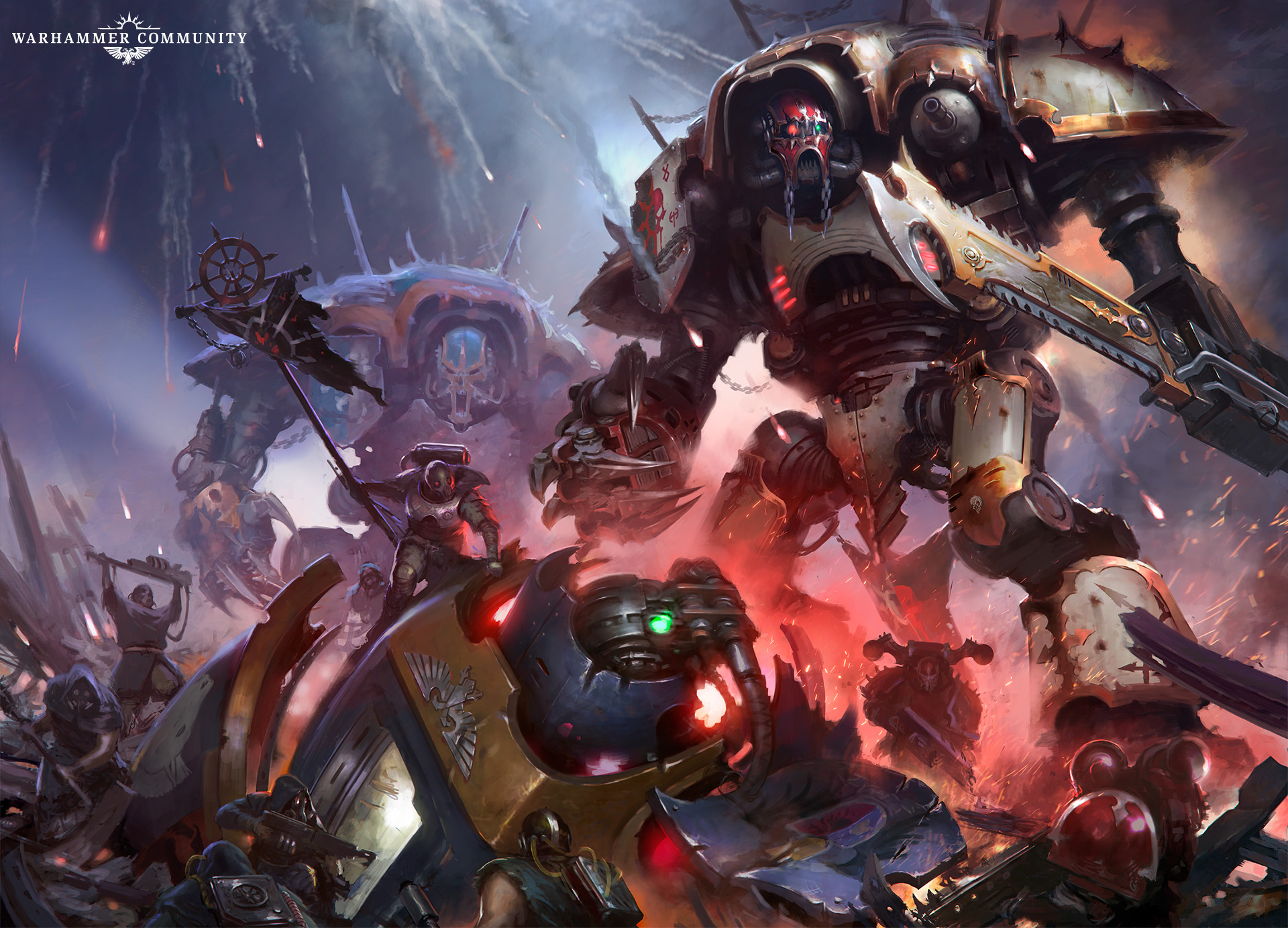 Is there anything more terrifying than the towering form of a Chaos Knight charging into battle at full tilt, stomping the enemies of the Dark Gods flat? We don’t think so, and we’ve been having a great time digging through the archives to find some awesome artwork of our favourite enormous warsuits* in action.