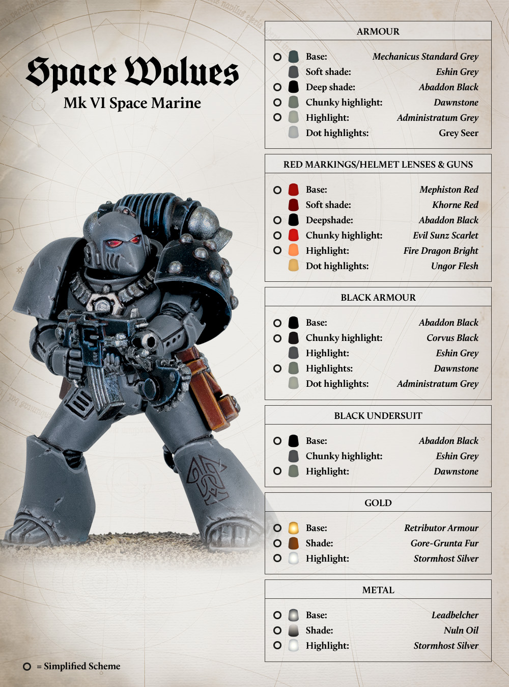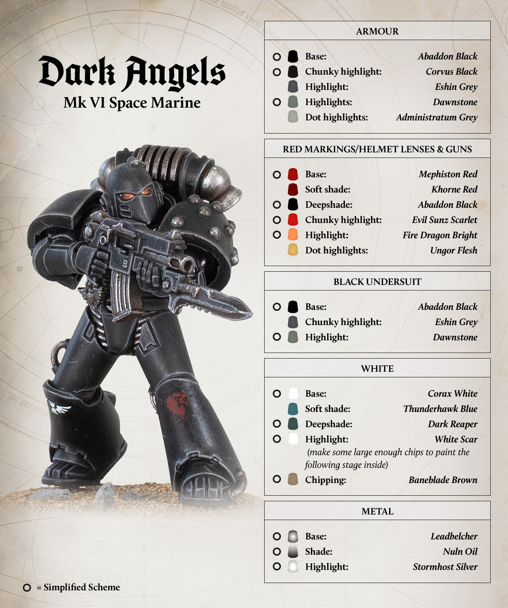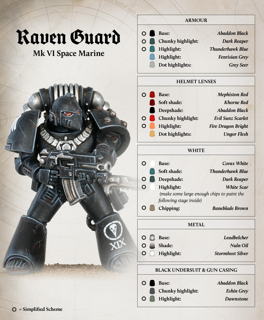 The Raven Guard value stealth above all, and so go to war clad in the umbral black of night. Markings are kept to a minimum, but where present are white, grey or sometimes gloss black. Banding dulled steel or bronze. Some render their battle plate in a subdued, matt black that absorbs so much light that even a Legionary merges with the night.