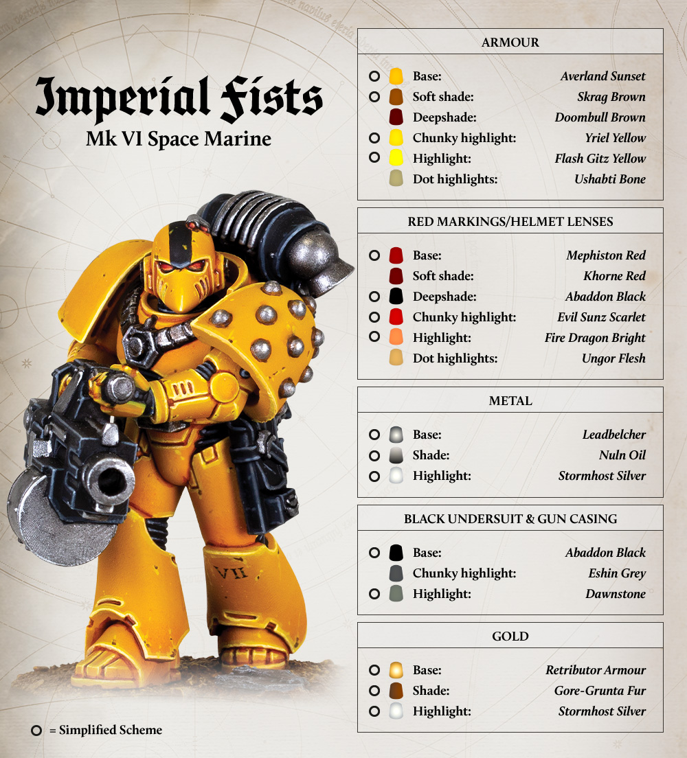 The Imperial Fists wear a distinctive orpiment yellow, banded with black and bearing occasional details in red or white. The Legion’s elite First Company invert this heraldry, wearing battle plate almost entirely of black, with only the helms and pauldrons yellow.