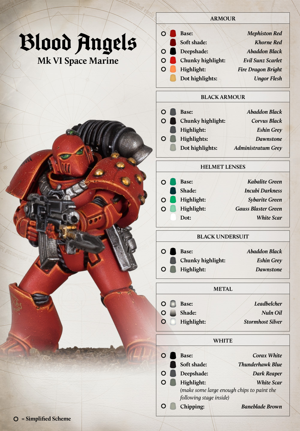 The Blood Angels make war resplendent in crimson and gold finery. The dominant colour is a vermillion red, with banding and other details shining gold. Individual segments, as well as cloth details are often black. Even when tarnished by war, the standard panoply of the Blood Angels is always a glorious spectacle to behold, superior to any other Legion except perhaps the Emperor’s Children.