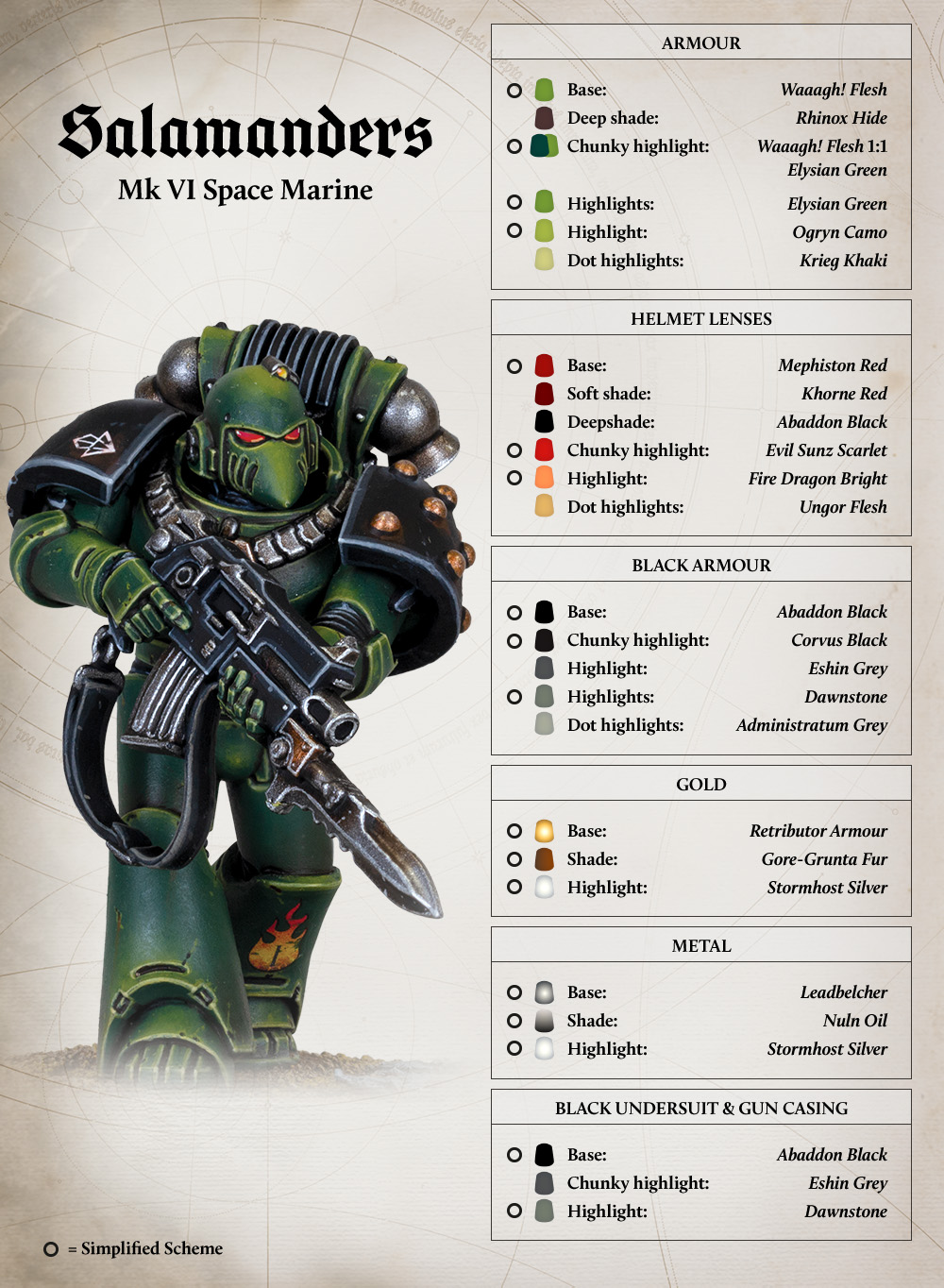 The Salamanders wear heraldry of chromium-oxide green, with contrasting elements of flame-orange and black redolent of the volcanoes of their home world. Banding is bronze or gold and often highly sculptural, with other symbols in white or black. The Legion suffered terribly at Isstvan V and were thus rarely able to maintain their battle plate to their high standards. Nonetheless, with every Legionary an accomplished metalworker, even the most battered and abused suit was kept functional.