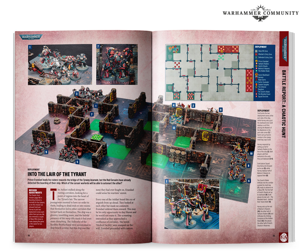 The action kicks off with a vicious close-quarters Boarding Actions game as Huron himself and his Masters of the Maelstrom fight to expel Aeldari Corsairs from their ship. Studio painter Harvey’s lavishly converted Corsairs won’t be easy to shift, though, as they’re led by Prince Erandael – using the rules for the new Prince Yriel – and are adept at using the ship’s movement-blocking hatchways to their advantage.