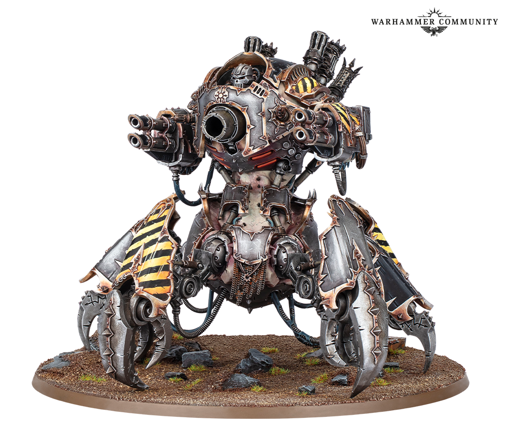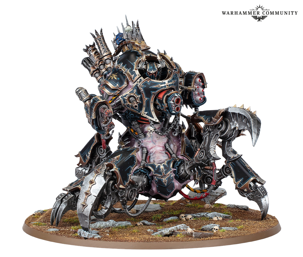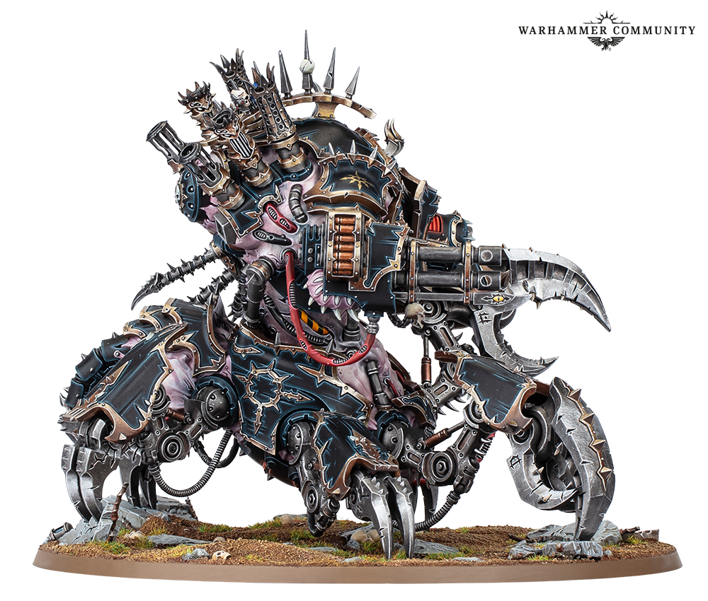 Defilers clank into battle at frightening speed on six crab-like legs, with the front two terminating in a pair of enormous claws that can shred steel plate like paper. Above the stabby, choppy part, the beast’s fleshmetal torso carries an arsenal of missiles and cannons to rival a battle tank, so the caged daemon inside has plenty to do while smashing towards their foe.