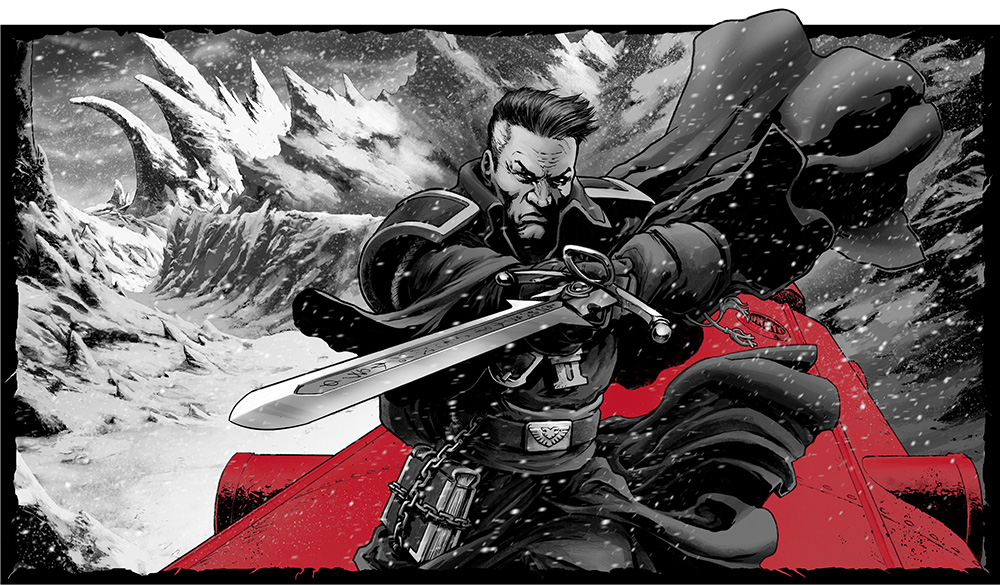 And, speaking of style, check out the man himself, Inquisitor Gregor Eisenhorn, battling atop a moving train in the mountains. As Dan says in his annotations, “If you’re going to stage a fight aboard a train, some of it has to happen on the roof”.