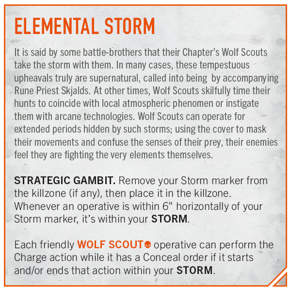 STRATEGIC GAMBIT. Remove your Storm marker from the killzone (if any), then place it in the killzone. Whenever an operative is within 6" horizontally of your Storm marker, it’s within your STORM.