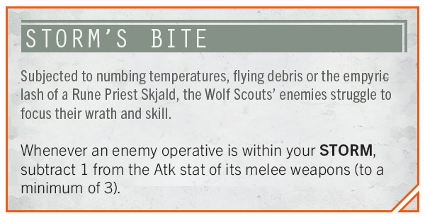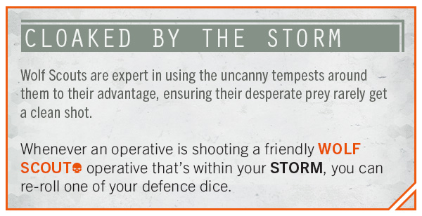 Whenever an operative is shooting a friendly WOLF SCOUT operative that’s within your STORM, you can re-roll one of your defence dice.