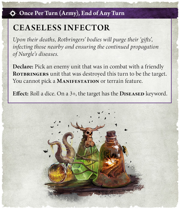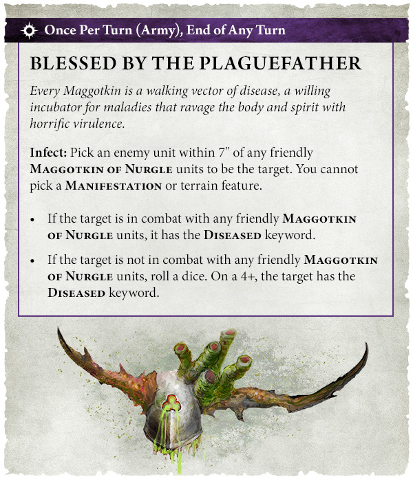 Infect: Pick an enemy unit within 7" of any friendly MAGGOTKIN OF NURGLE units to be the target. You cannot pick a MANIFESTATION or terrain feature.