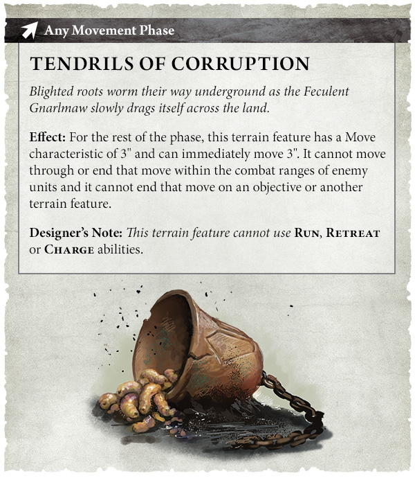 Blighted roots worm their way underground as the Feculent Gnarlmaw slowly drags itself across the land.