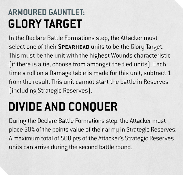 In the Declare Battle Formations step, the Attacker must select one of their SPEARHEAD units to be the Glory Target. This must be the unit with the highest Wounds characteristic (if there is a tie, choose from amongst the tied units). Each time a roll on a Damage table is made for this unit, subtract 1 from the result. This unit cannot start the battle in Reserves (including Strategic Reserves).
