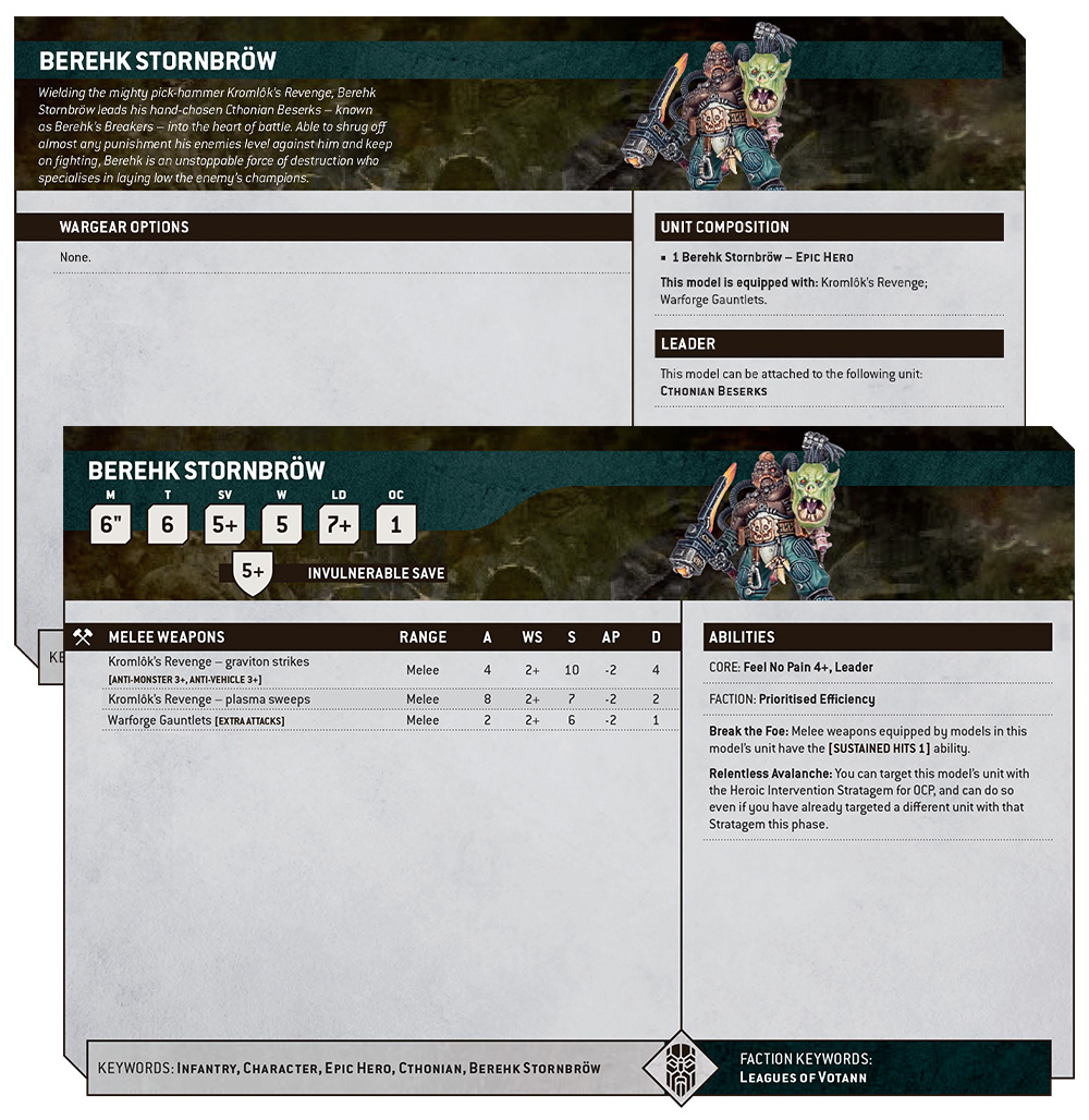 Unlike the Twin Lance pair that we had a look at on Monday, Berehk can join a unit and inspires them to fight all the harder in his presence. Giving Cthonian Beserks the [Sustained Hits 1] ability leads to some pretty epic carnage, and since their concussion mauls also pack the [Anti-Monster 3+] and [Anti-Vehicle 3+] rules, Big Guys really hate to see them working together.