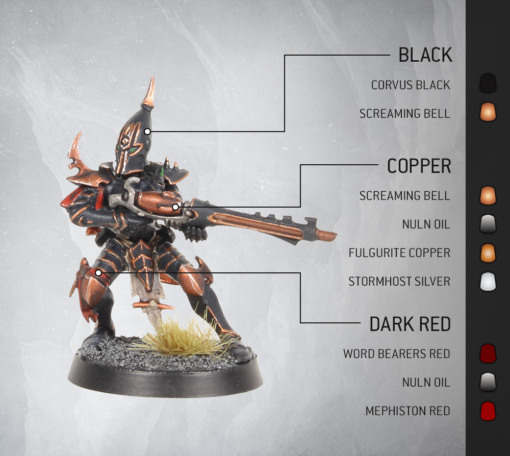 Over the last few years, I’ve painted a few heroes, units, and larger models for this collection. It may be small compared to its predecessor, but the unity of the ashen black, dark red, and copper accents is something I have been proud of – so proud, in fact, that I’m happy to share the key parts of this colour scheme with my fellow Drukhari enthusiasts.