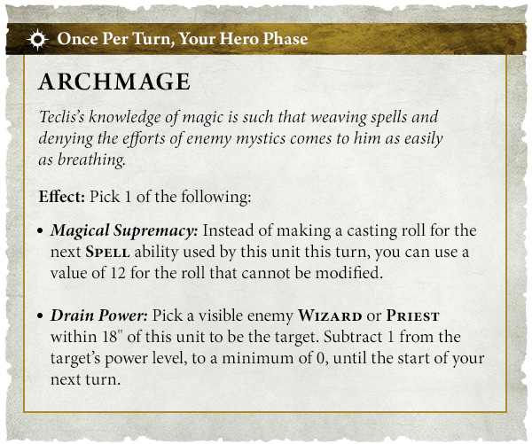 Archmage Teclis may be somewhat weakened after his climactic battle with Nagash years ago, but just like the Supreme Lord of the Undead, he is not resting on his laurels.** With the Skaven menace threatening the realms, Teclis has altered his approach to battle. The Archmage can choose to exercise either Magical Supremacy and cast a spell with an unmodified roll of 12, or Drain Power from a nearby wizard or priest and subtract 1 from their power level.