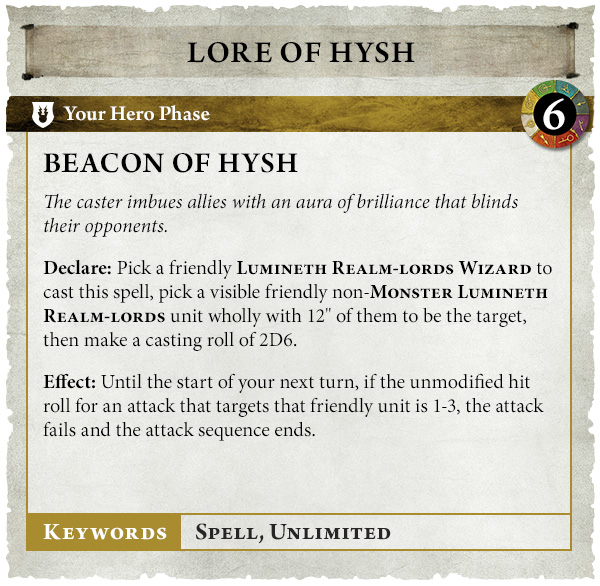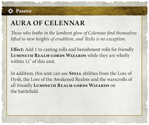 In addition, this unit can use SPELL abilities from the Lore of Hysh, the Lore of the Awakened Realms and the warscrolls of all friendly LUMINETH REALM-LORDS WIZARDS on the battlefield.