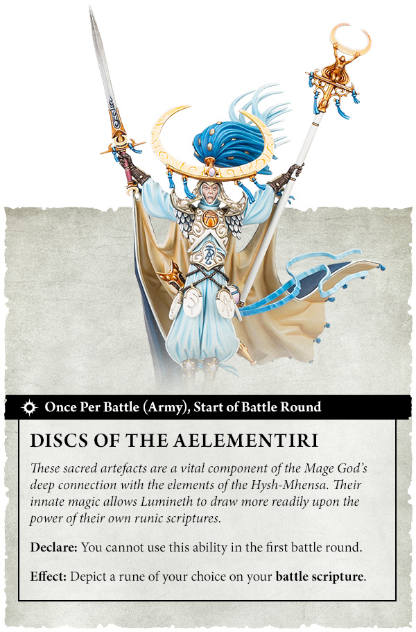 *** It’s your choice which order to perform Start of Battle Round abilities, so make sure you use the Discs of the Aelementiri before depicting a rune, to get those extra bonuses.
