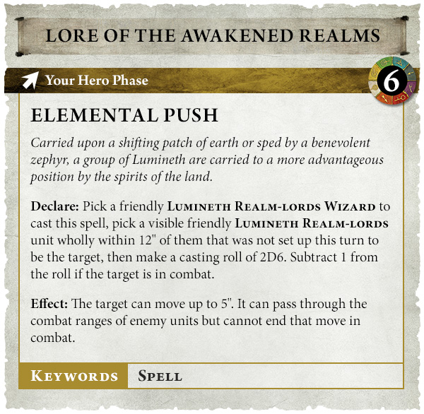 The new Lore of the Awakened Realms is all about drawing power from the spirits of the realms themselves, like Focused Erosion, which unifies the power of wind, water, and earth to subtract 1 from the Rend of enemy weapons. Realmshield is the new version of Protection of Hysh, which now only needs a casting roll of 7 to succeed, while Elemental Push calls on wind spirits to move a unit 5” with very few restrictions, so you can whisk a unit out of combat if you so wish.