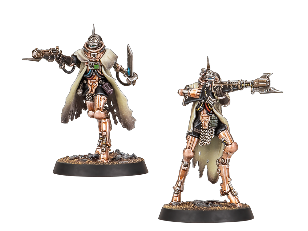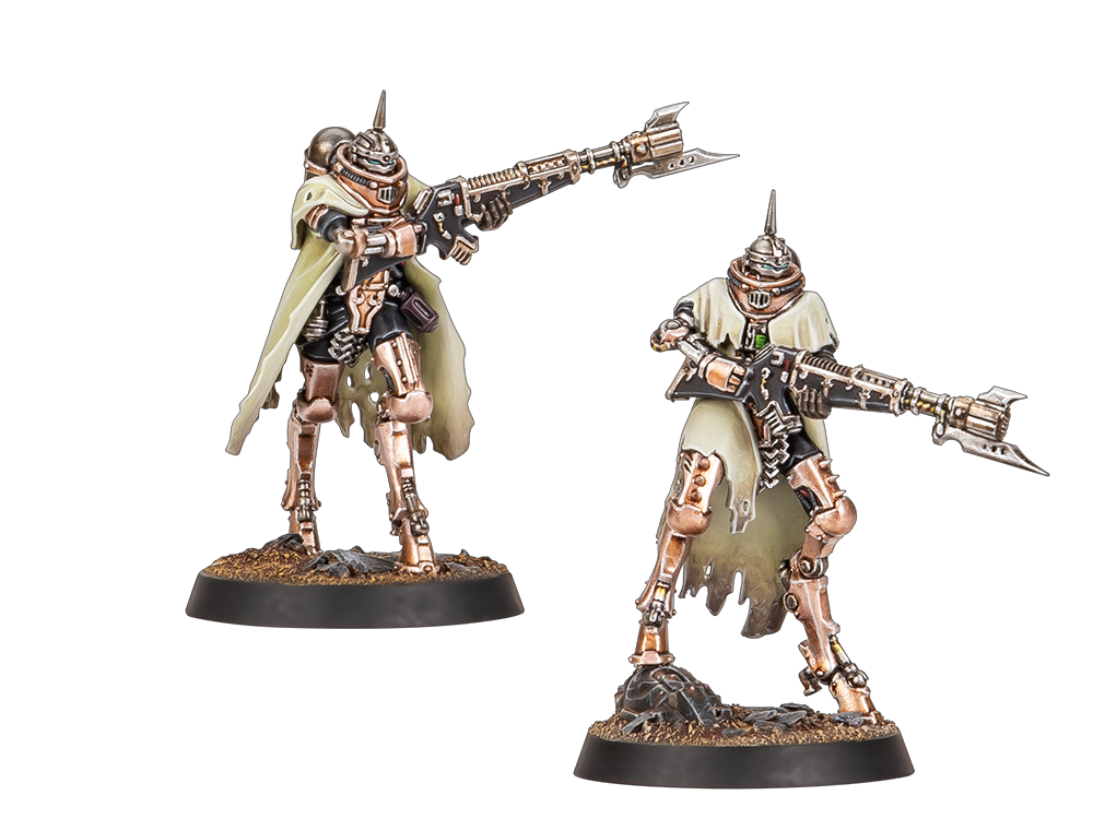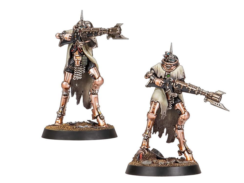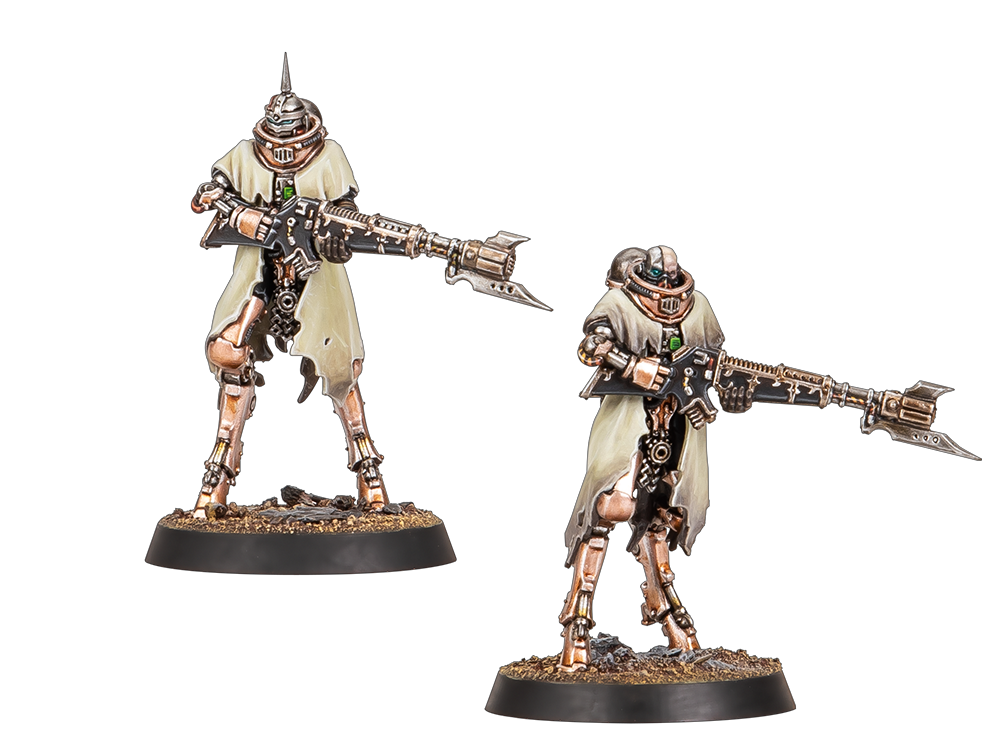 Bestowed with the collective skills and wisdom of a thousand past warriors, the Skitarii take to the field as agile and resilient light infantry. Deployed as units of eight to 16 Battle-Pilgryms, these capable warriors stand somewhere between the innumerable hordes of Tech-thralls and more heavily reinforced Thallax Cohorts, laying down volleys of powerful close-ranged fire from voltlock arquebuses.
