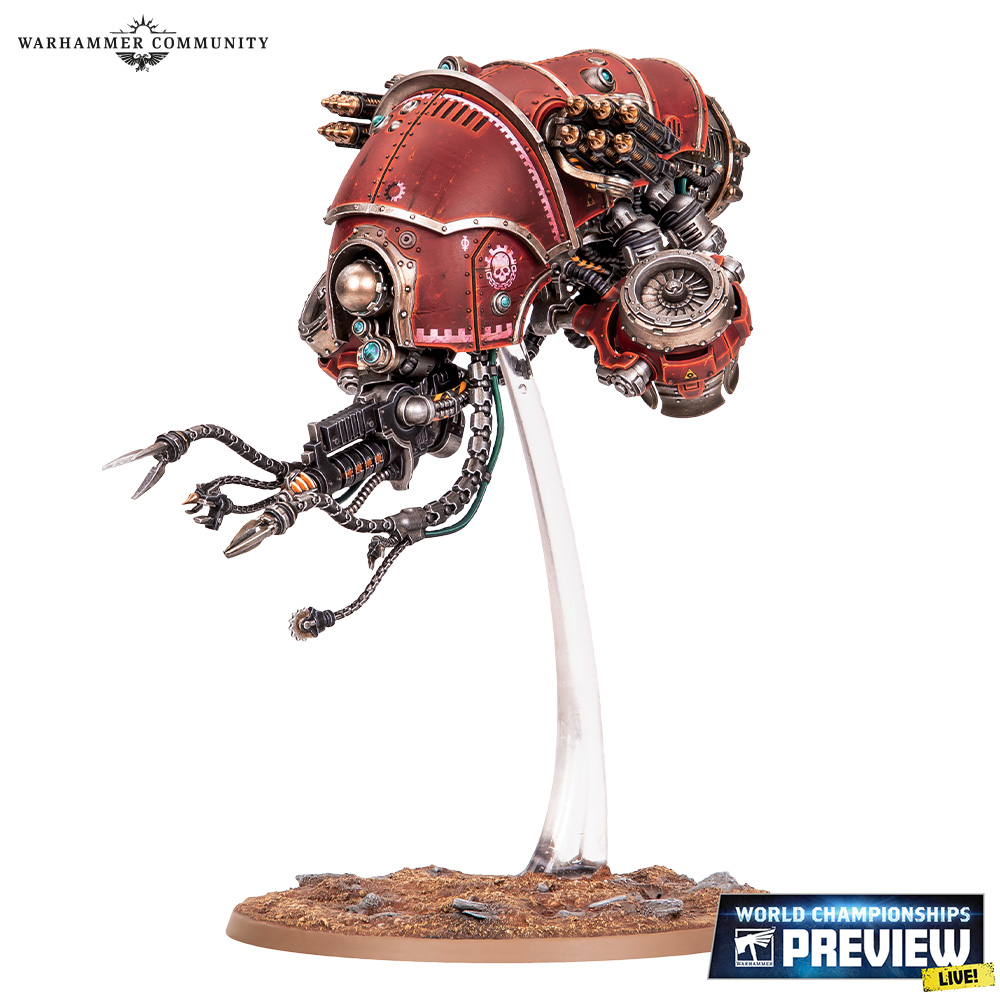 Skitarii conclaves generally operate under their own power and are granted access to very few of the Mechanicum’s battle automata, but among those they do deploy, Vultarax Stratos-automata are some of the most common. These floating machines are retrofitted with extra scanning arrays and auspices to help search for lost relics, and cover the advance of the Battle-Pilgryms with barrages of missiles and arc blaster fire.