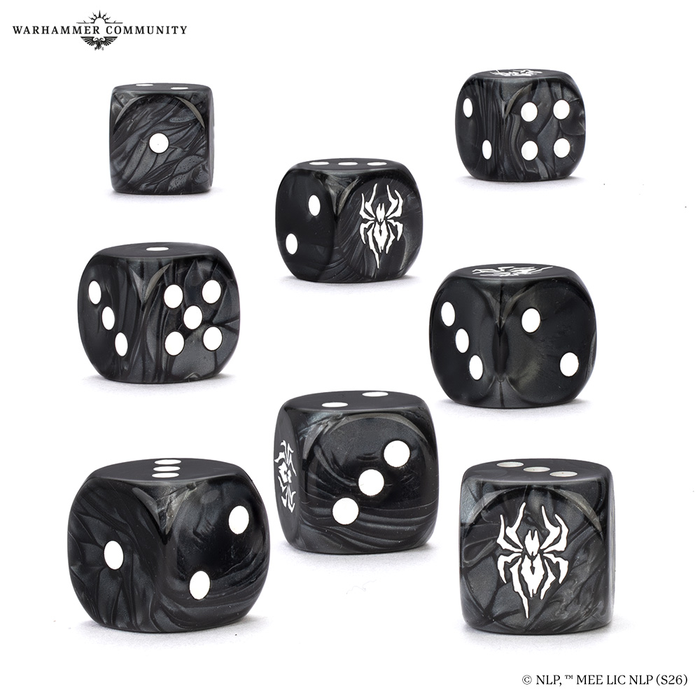Bring the dark and gloomy vibes of Cirith Ungol to your Evil army with a set of eight matching dice, cast in smoky black plastic with white pips and a spider-like icon on the six face to represent Shelob herself.