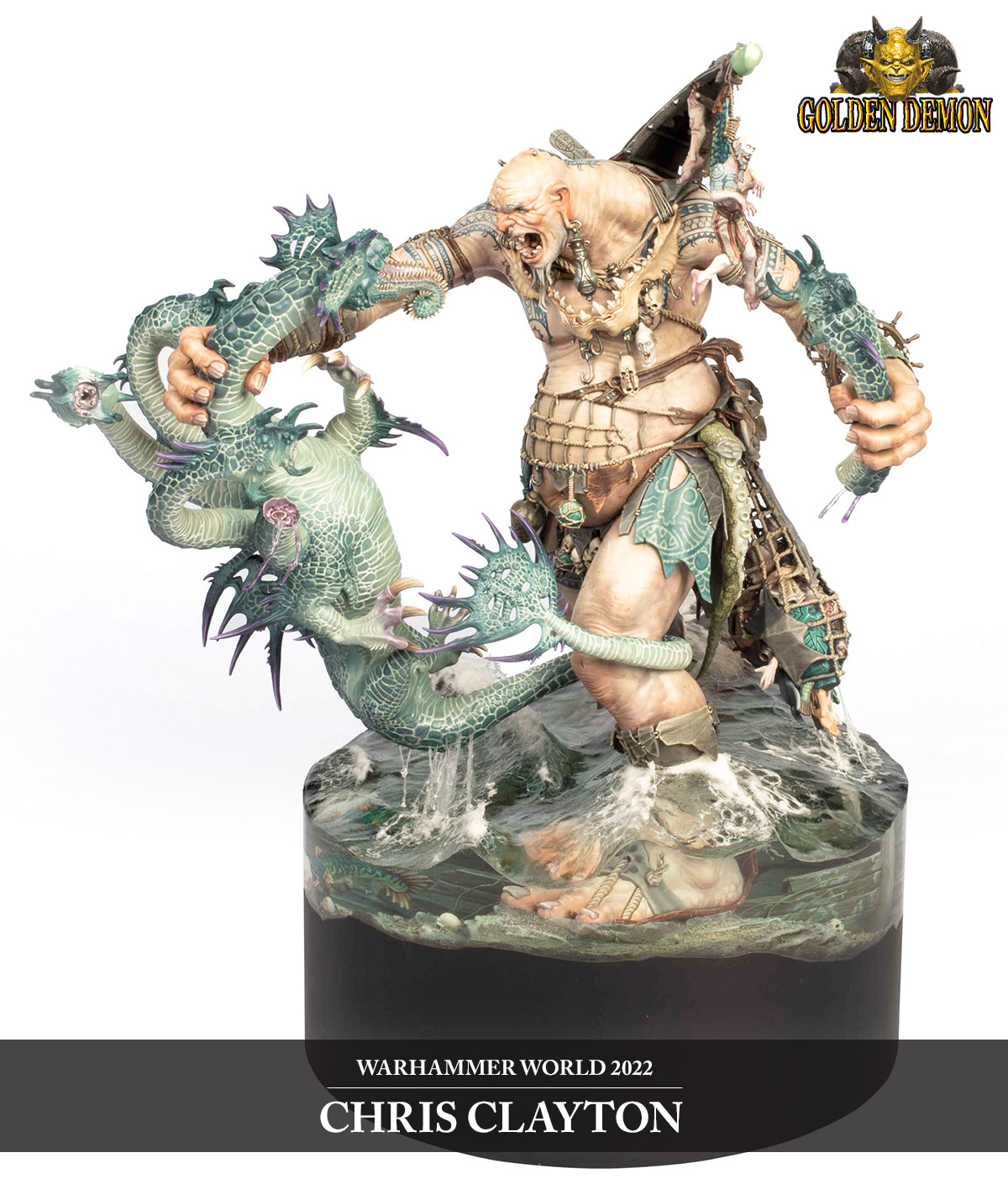 From the smallest inhabitants of the Mortal Realms to one of the largest, Chris Clayton stunned everyone who had come to Golden Demon at Warhammer World with a titanic duel between a Kraken Eater Mega-gargant and an unlucky Kharibdyss. Thanks to a herculean conversion task, rendered gorgeously and finished off with a daring resin pour to represent the stormy seas, Chris rightfully lifted the Slayer Sword.