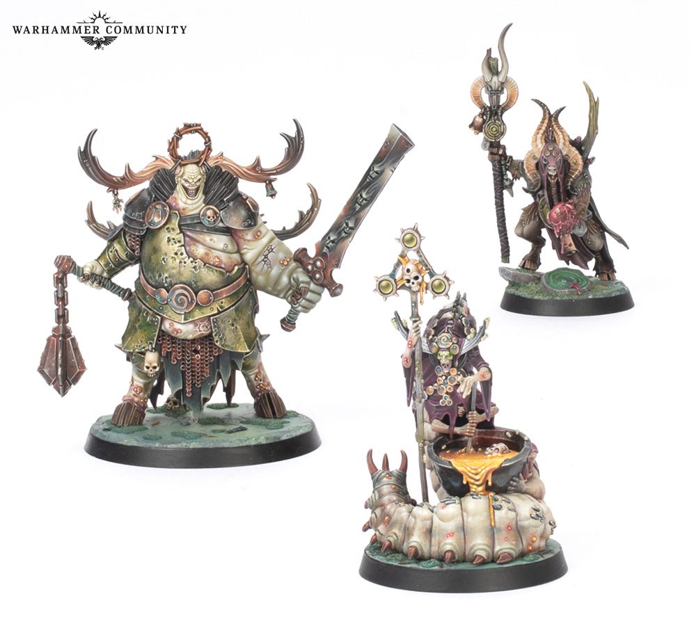He is joined by Belga the Cystwitch, who causes diseased foes to suffer even more with each death summoning Plaguebearers, and Shaman Foulhoof, who enhances the combat prowess of Pestigors and uses his sorcery to weaken enemy weapons. All three are push-fit, single pose miniatures.