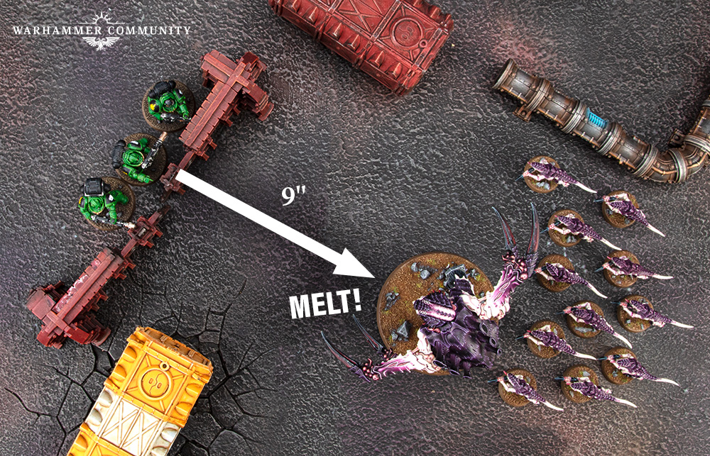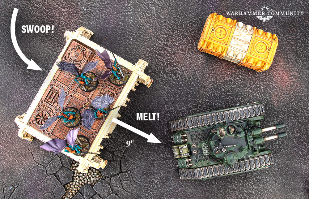 Assault weapons enable a unit to Advance and still fire those weapons. Some Assault weapons also possess additional rules like Melta, which inflicts extra damage if you can reach half range. Be mindful of where you place such weapons in a unit so that they are close enough to the enemy to benefit from these abilities. At the same time, be wary of fast-moving units such as Scourges that have access to Assault weapons. With a Movement of 14", a potential 6" Advance and 18" range on their blasters, shredders and heat lances with Melta 3, their threat range and damage output are both huge.