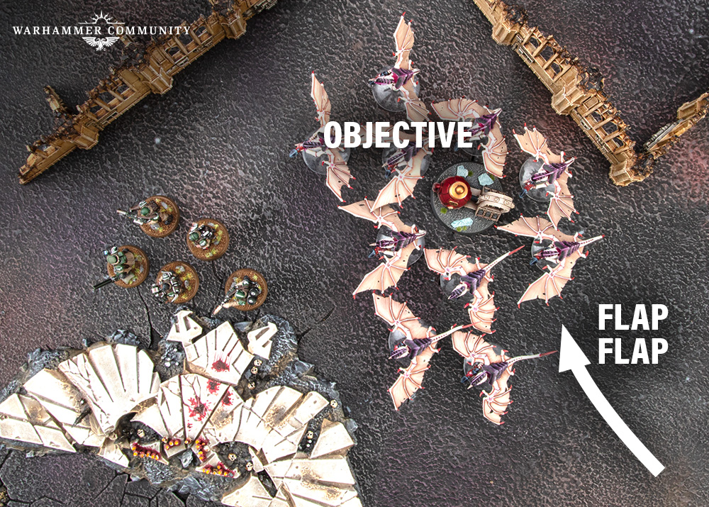 The ability to make a move after shooting opens up several tactical possibilities. Use this ability to fire and then move behind terrain, making yourself less susceptible to return fire, for example. Or, after clearing a unit off an objective, leverage the extra move to secure that objective for your forces. Another effective approach is moving, shooting, and then moving again to achieve Secondary Missions like Engage on All Fronts or Behind Enemy Lines. Gargoyles are especially good at this as they can move 12" plus their Advance roll, still shoot (thanks to their Assault weapons), then use their Winged Swarm ability to move out of charge range or onto an objective.