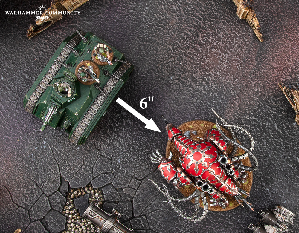Some Transport vehicles have the Firing Deck rule, which enables some models to shoot while embarked. This is especially useful as it enables the embarked unit to make the most of the vehicle’s movement to get into a beneficial position, then add their firepower to that vehicle’s shooting in the Shooting phase while being protected by the vehicle’s armour. Ork Trukks and Drukhari Raiders are the prime examples of this (admittedly the Drukhari are much better at shooting), though the Chimera also has this rule, which means you could fire up to two weapons (meltaguns or lascannons would be nasty) out of the top hatch.