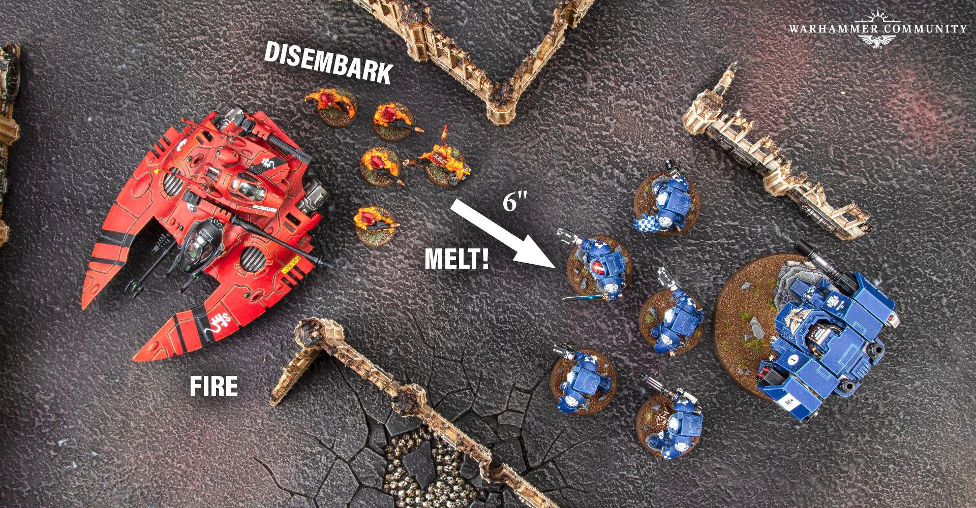 Let’s put a combination of these rules together. I’ll use a unit of Fire Dragons in a Falcon as my example. The Falcon can move up to 20" if it Advances, so you can get your Fire Dragons into position early on. In the second battle round, you can then disembark your Fire Dragons up to 3" from the Falcon. They have a move of 7", plus up to a 6" Advance, plus the 12" range of their fusion guns, which have the Assault rule. This gives them an effective range of 28" – though ideally 22" to make use of their Melta 3 guns. You’ll also get re-rolls to wound if the Falcon fires at the target first.
