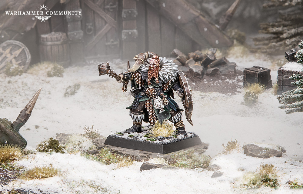 My tribe’s paint scheme is built on warm, grimy colours that I felt would be appropriate for a band of Marauders carving a harsh existence from the northern wastes. I used the orange hair and beards as the only spot of bright colour almost by accident, as these didn't contrast with the reds and browns, but helped to make the models’ faces stand out. I also wanted to avoid much in the way of "fancy" materials – these aren’t the pampered nobles of the Empire, after all. That’s why almost all of the metal is rusty iron – only the Headman's belt buckle (in the shape of the eight-pointed star) is painted as a mucky bronze.