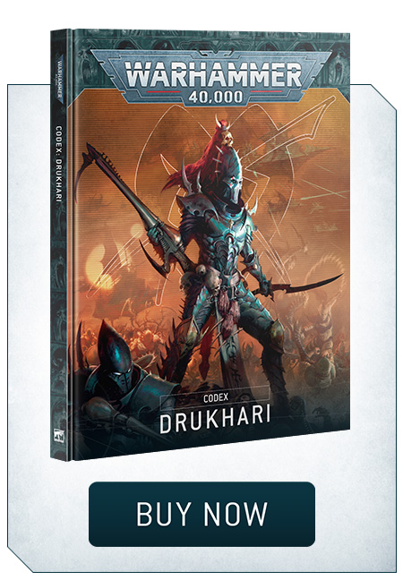 Your first stop is Codex: Drukhari – the essential companion to the faction, containing plenty of background lore and a showcase of gorgeously painted miniatures, as well as rules for 21 different units and plenty of different ways to play them. Together with a copy of the Warhammer 40,000 Core Book, you’ll have all the rules you need to start playing full-size games of Warhammer 40,000.