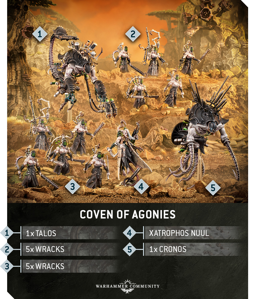 The Coven of Agonies is led by a brilliant but utterly depraved Haemonculus named Xatrophos Nuul, whose misshapen creations lumber into battle as two units of five Wracks – orderlies and apprentices whose tough hides can turn aside a surprising amount of firepower. Having two units means that you can cover much more ground, and safely contest objectives while the rest of your force goes for the kill.