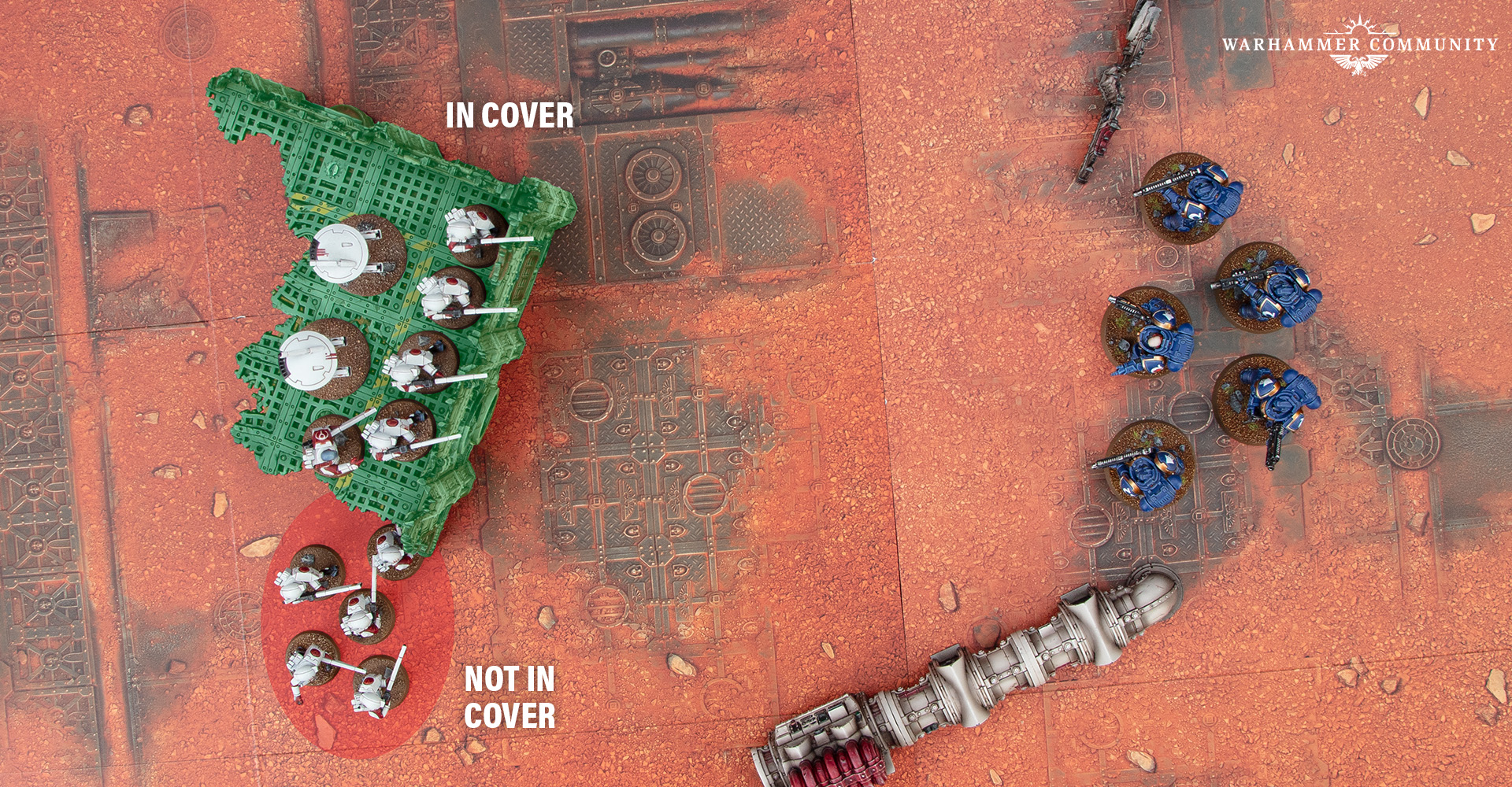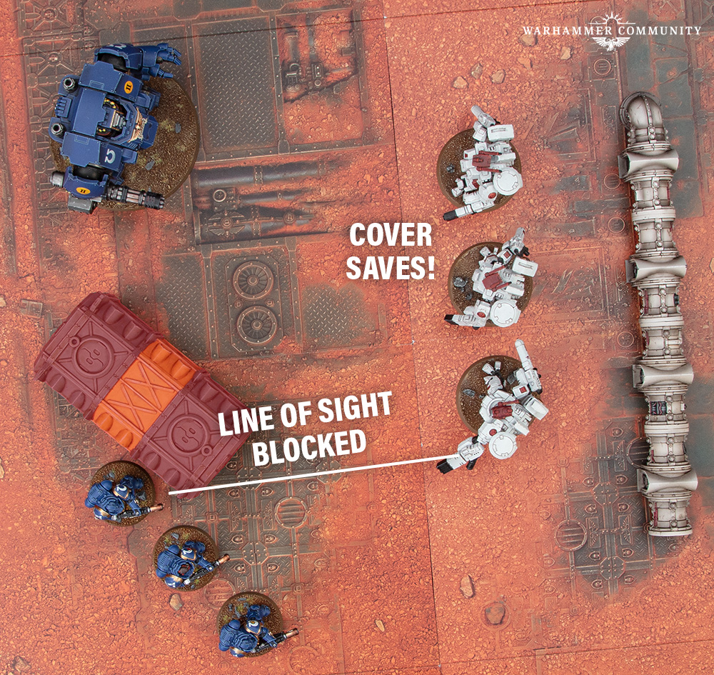 In this example, the Heavy Intercessors can draw line of sight to all of the Fire Warriors. The ones in the building have the Benefit of Cover, while those outside do not. The T’au Empire player chooses where wounds are allocated. If they allocate wounds to models not in cover, their save will be reduced to 5+, whereas those in cover will be able to mitigate the AP −1 from the Heavy Intercessors’ guns and make their saves on 4+.