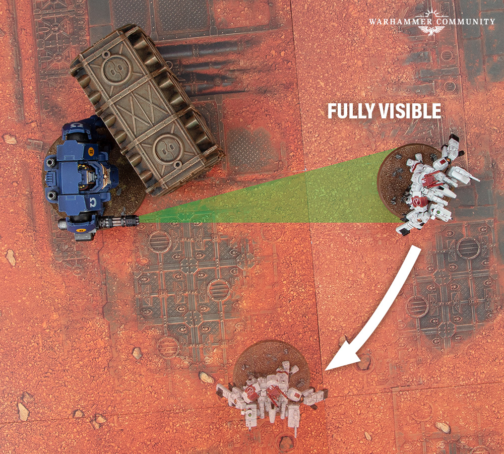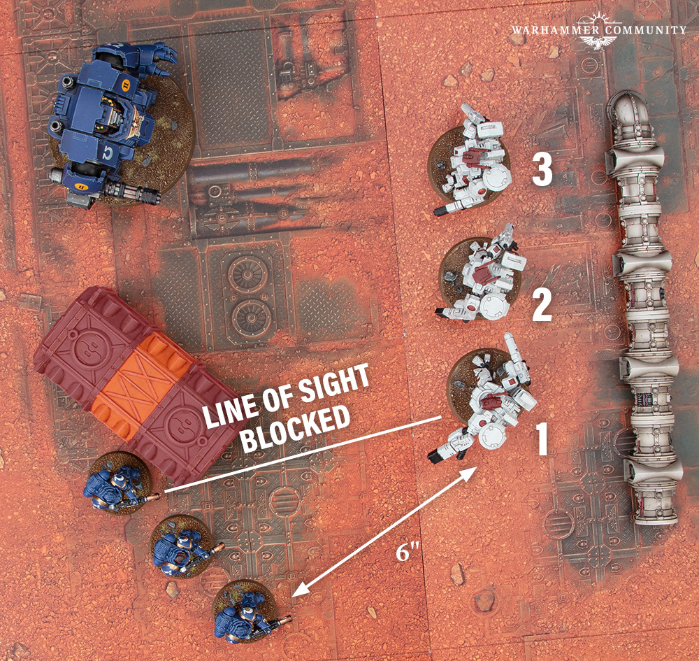 Continuing the example above, imagine that the Space Marines player does shoot with the Eradicators first. Because one Eradicator can’t draw line of sight to every model in the T’au unit, the Battlesuits count as being in cover to the Eradicators. This is crucial because against those AP −4 melta rifles they will still get a 6+ save. It may not be much, but it’s better than nothing and could see one of them survive to become a nuisance later on. Depending on the tactical situation across the battlefield, it might be worth moving the Eradicators so they can see every model in the unit fully and deny them any save at all.
