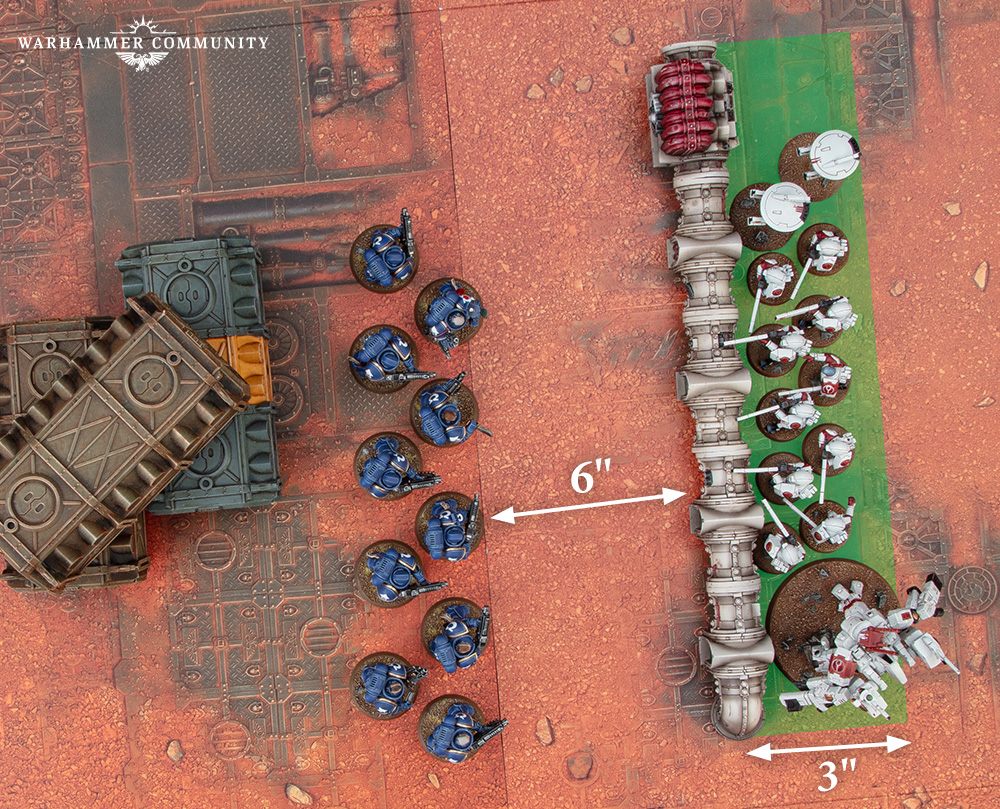 Some players make the mistake of thinking that if the Intercessors are also within 3" of the pipes, the Fire Warriors will not gain the Benefit of Cover. This is not the case as they are still only partially visible despite the close range. Also be aware that Engagement Range is 2" when fighting across a fuel pipe or barricade, so don’t get too close.