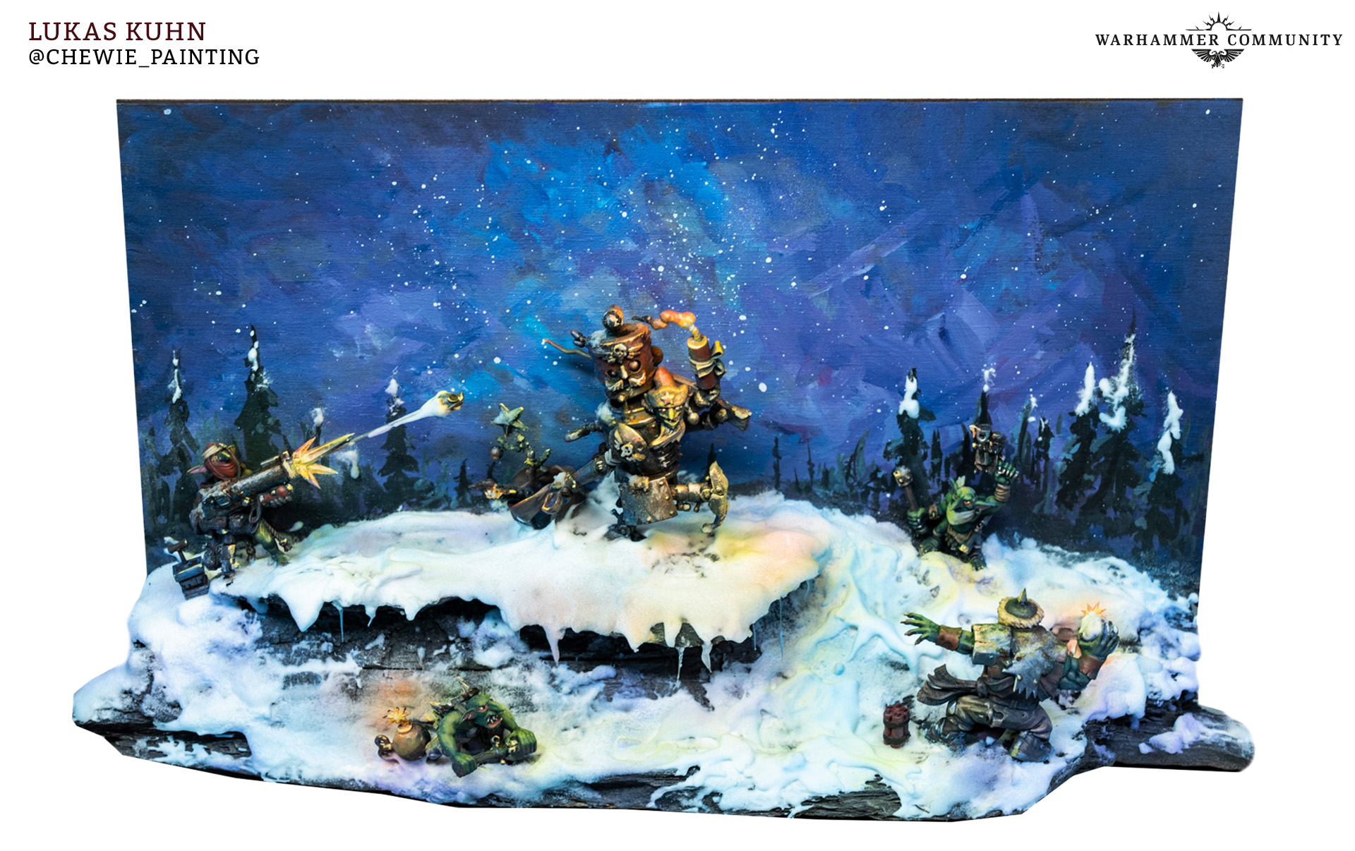 Finally, a handful of contributors decided to create full-on dioramas for their Tinboys, with Christine putting Da Red Gobbo into an awkward doppelganger situation, while Sam’s slides across a frozen pond and Lukas sends his on a merry march through the midst of an Orky snowball fight.