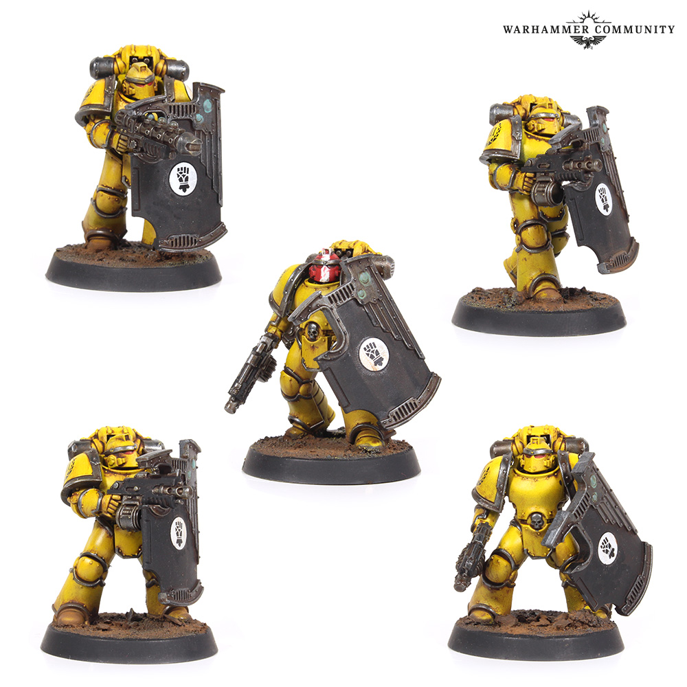 The yellow is a pretty simple recipe – I use Zandri Dust spray for the base coat, then White Scar spray at an angle above the minis to create a zenithal highlight, before airbrushing Yriel Yellow over the whole mini. The breacher shields themselves I wanted to keep Abaddon Black, as I use a lot of black in the army to break up the yellow. A little bit of weathering (using watered down Thondia Brown) and the Imperial Fists Legion symbol in the centre was enough to give them the pop I wanted.