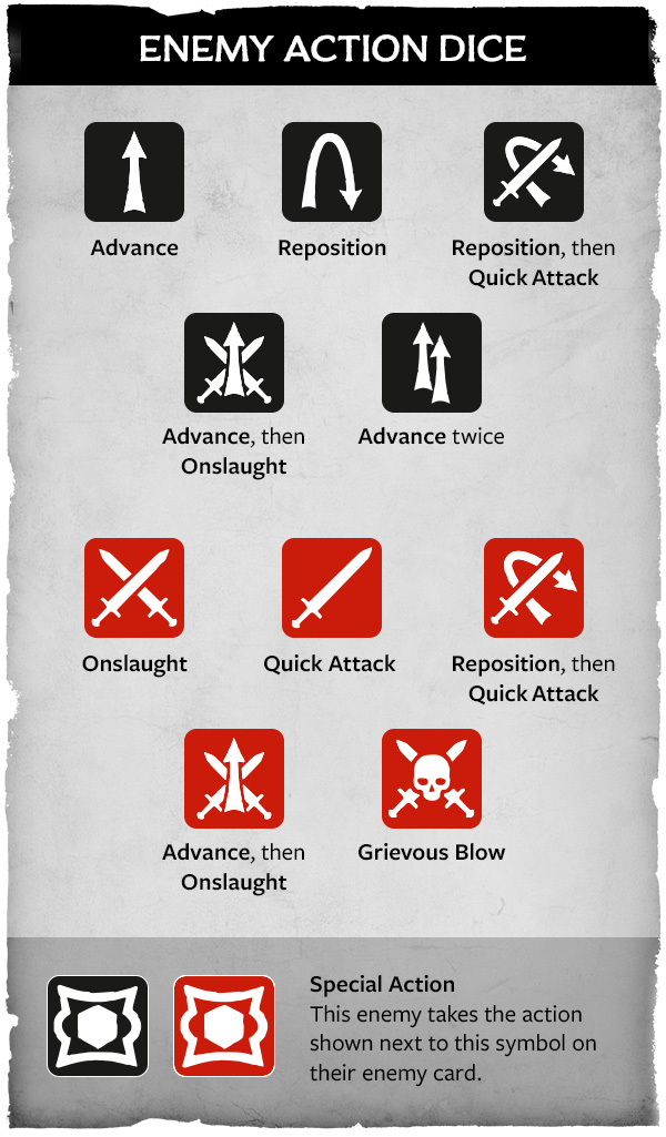 This enemy action dice has a number of instructions on, such as Advance: move to the nearest hero, and Reposition: find the furthest enemy hero they could attack after moving and move towards them. There are also combo abilities like Reposition, then Quick Attack; Advance, then Onslaught; or Advance twice. Quick Attacks are weaker assaults where critical hits are turned into normal hits, while Onslaught is your standard attack action that can score critical hits.