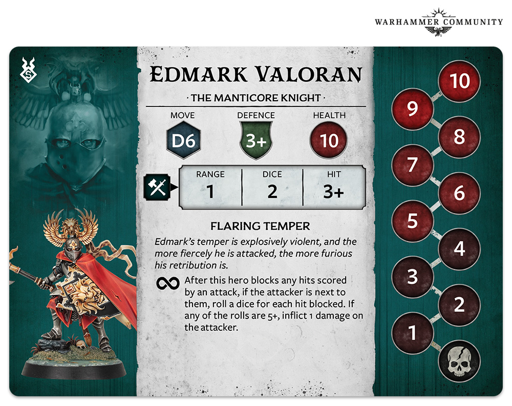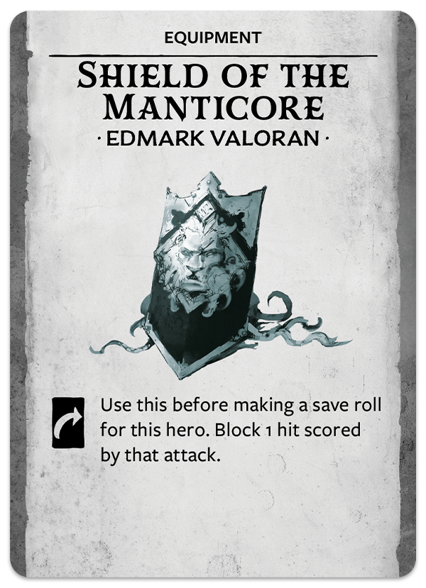 Each hero also has a unique ability on their card – Edmark’s passive ability Flaring Temper is used any time he blocks a hit, letting him lash out and deal damage in response on roll of 5+ – and a piece of signature equipment. The Manticore Knight fittingly has the Shield of the Manticore, which you expend – that’s the arrow icon – before making a save roll to automatically block one incoming hit. Flaring Temper can even trigger in response to hits blocked by his shield!