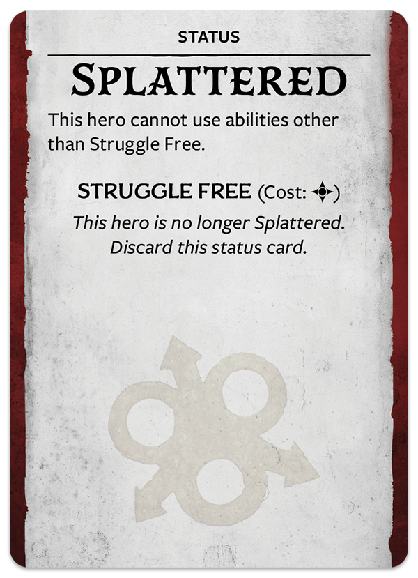 On the next turn, a group of three Mire Kelpies will all Retch and give an enemy the Splattered status card, which prevents them from acting until they spend an energy to clean themselves off. There are other status cards to watch out for as well, and not all are quite so lenient as Splattered. There are instructions on what to do if your whole party is already covered head to toe in effluence, or if you’re all wisely hiding out of sight. After the third round, the behaviour track resets and you’re back to black enemy action dice.