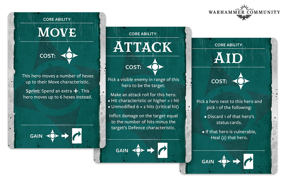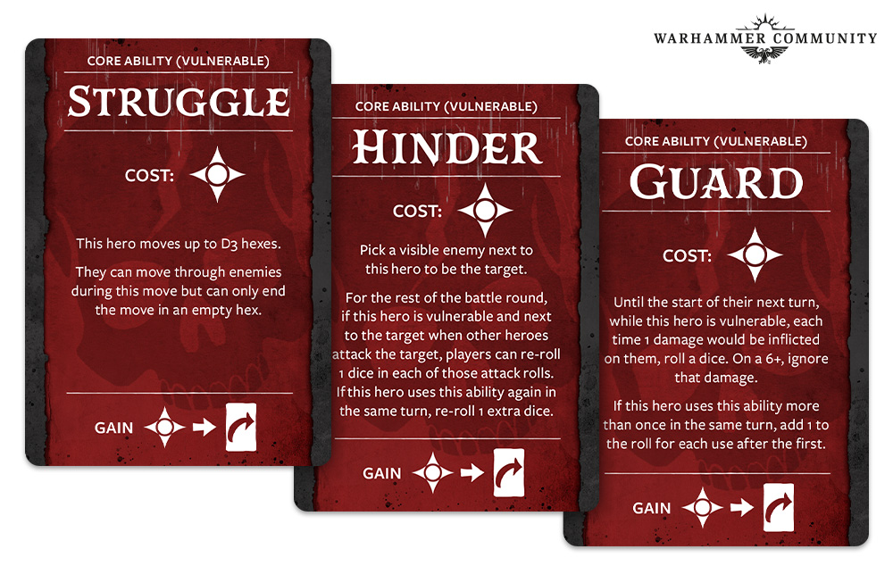 If a hero takes damage while Vulnerable, one of their abilities becomes infected – and requires two energy to use instead of one. If all a hero's abilities are infected, enemies will ignore them while moving and attacking, believing rot and entropy will sort the rest out. Thankfully, healing through Aid, or via a Sip of Aqua Ghyranis reward card**, or just through a free small D3 heal after each encounter gets them back on their feet and ready to fight again, though being in such a precipitous state doesn’t bode well for the next encounter…